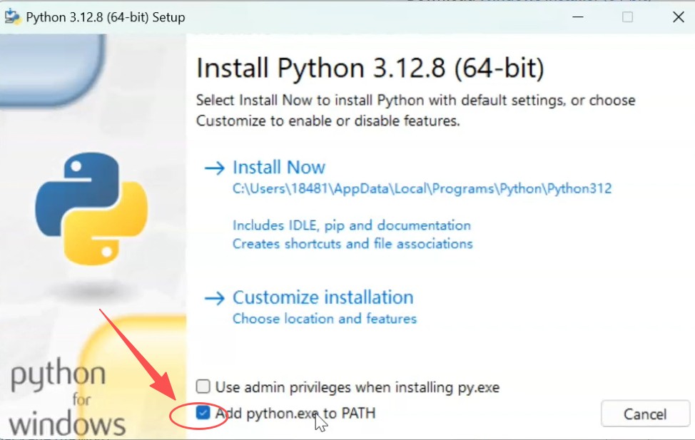 Add Python to PATH(添加到环境变量)。 如果忘记勾选,后续在命令行里输入python是找不到环境的。
