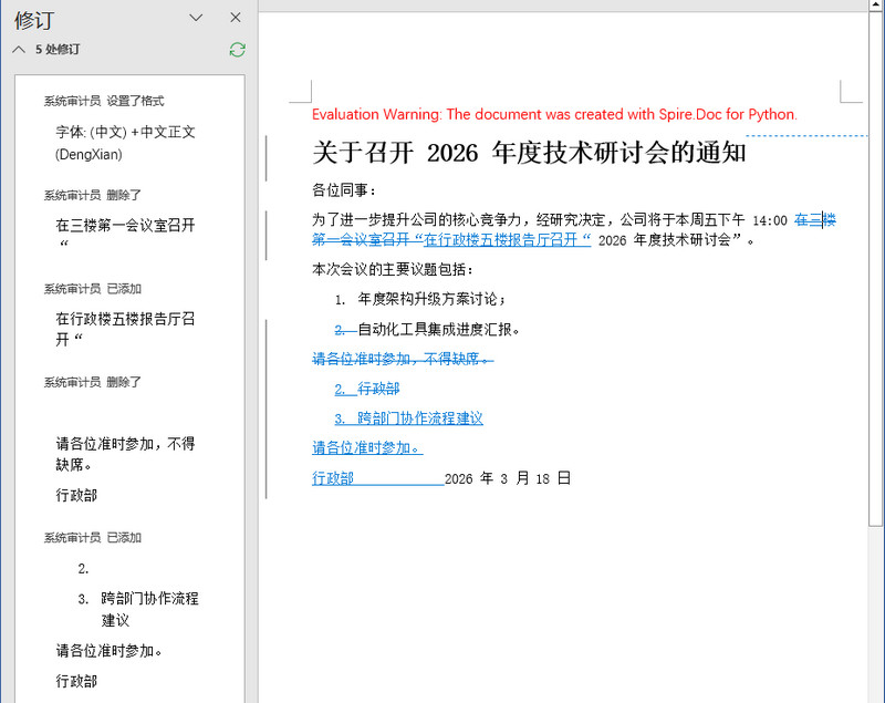 在办公自动化场景中,最直接的需求通常是快速找到两个 Word 文档之间的变化。例如,面对会议通知-初稿与会议通知-修改稿,我们可以通过几行简单的 Python 代码,驱动 Spire.Doc 的比对引擎自动完成分析。