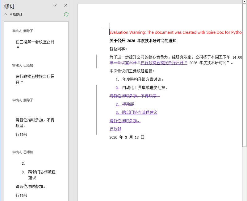在处理合同审批、技术文档迭代或公文修订时,手动核对不同版本间的修改和差异较为耗时。即便 Word 自带比较功能,频繁的点击和文件切换也难以满足现代化办公对工作效率的要求。利用 Python 配合 Spire.Doc 库,我们可以将这种重复性的手动操作转化为自动化脚本,不仅能批量生成标准的修订文档,还能通过程序屏蔽无意义修订,实现更准确的内容审计。