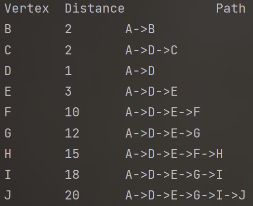 Vertex Distance Path B 2 ->A->B C 3 ->A->C D 1 ->A->D E 3 ->A->D->E F 6 ->A->D->E->F G 10 ->A->D->E->G H 8 ->A->D->E->F->H I 11 ->A->D->E->F->H->I J 13 ->A->D->E->F->H->I->J