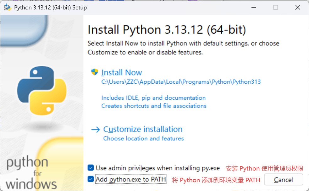 'python'不是内部或外部命令,也不是科运行的程序 或 跳转到微软商店,这两种情况都是因为没有添加 Python 环境变量,需要卸载 Python 重新安装,确定勾选Add python.exe to PATH即可。