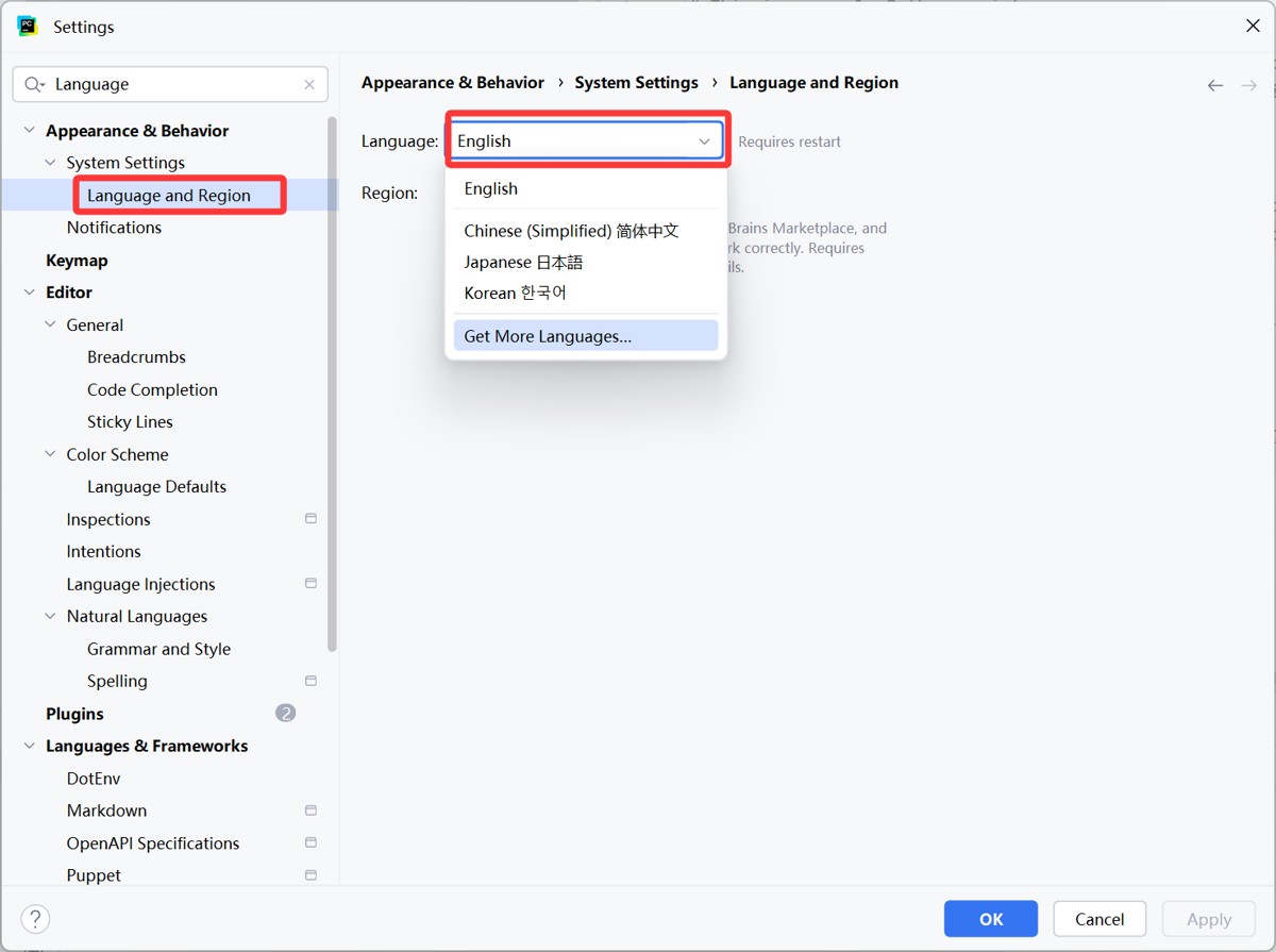 在Settings 设置内,可以搜索Language,点击Apperance & Behavior → System Settings → Language and Region 中,可以直接将语言改为中文,点击 OK 即可。