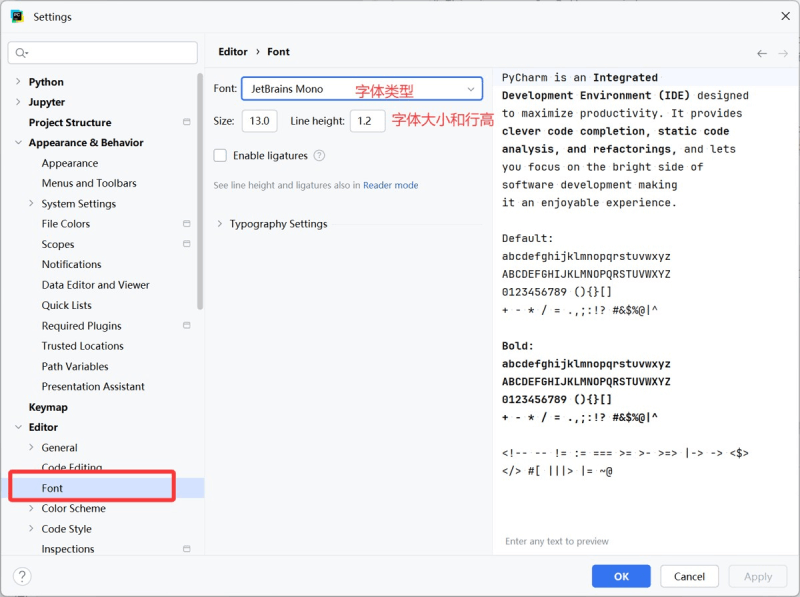 点击Editor → Font,这里可以设置字体大小、类型和行高,右侧是示例字体。
