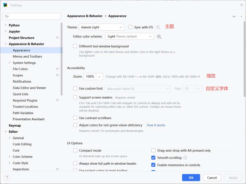 点击Appearance & Behavior → Appearance,这是外观,在这里可以设置主题(深浅色)、缩放大小、自定义字体等。
