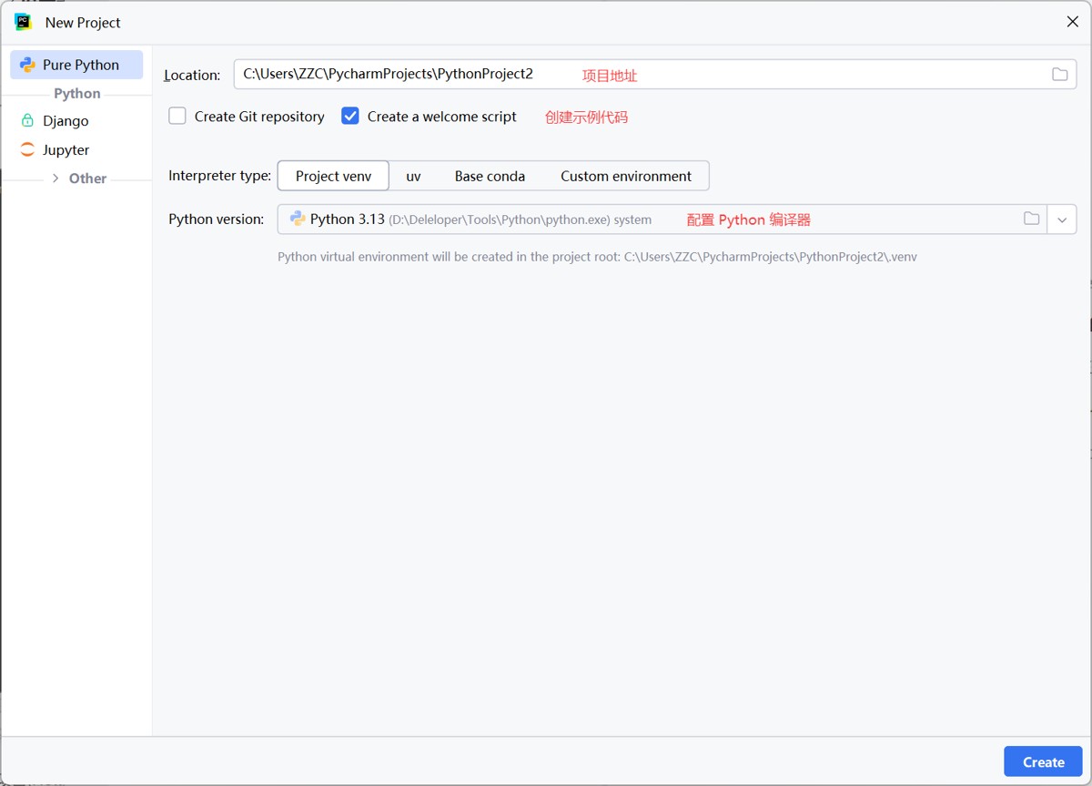点击 新建项目(New Project),这里最重要的是配置 Python 编译器,如果没有 Python 编译器,可能是没有安装 Python 回到上面进行安装。