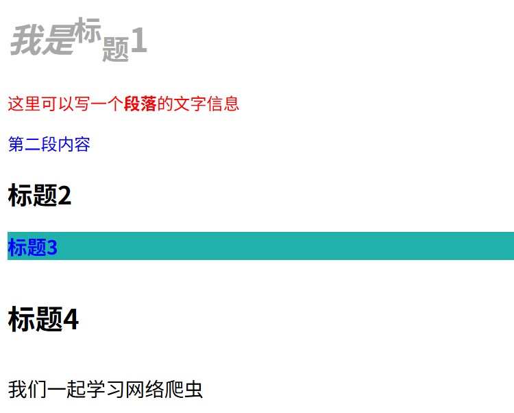标题标签h1-h6表示6级标题(字体大小递减),段落标签p用于包裹正文文字: