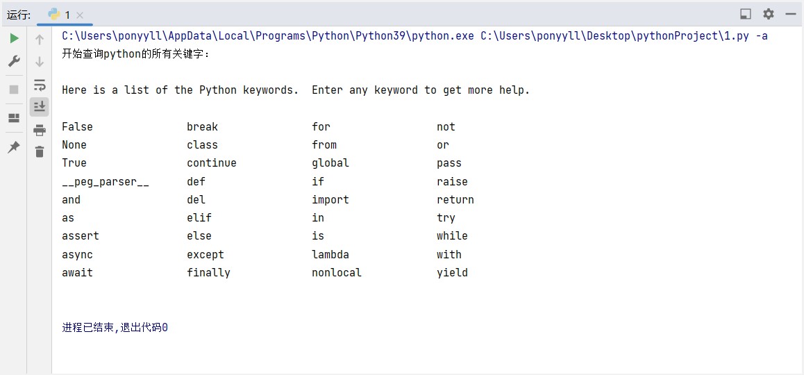 # cmd执行命令:python tool.py -a (查询Python关键字)