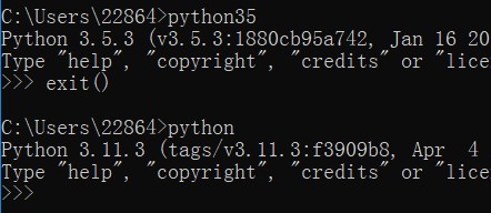 找到上面python35的路径,打开文件夹,找到python.exe,给它改一个名字,比如改为python35.exe,然后重新打开一个命令行窗口,输入python35就会找到python3.5版本,而输入python会直接找到python3.11,也就是没改名的那一个。