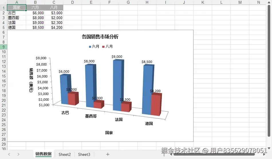 上述代码创建了一个包含三个列的数据表:第一列为国家名称(分类),第二列和第三列分别为六月和八月的销售数据。通过设置单元格的样式,使表头具有深色背景和白色字体,数值区域使用货币格式显示。