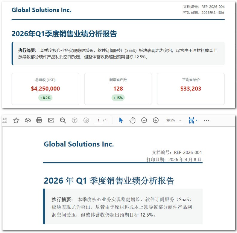 适合需要生成高质量报告、发票等专业文档的场景,特别在处理表格、字体嵌入和多栏排版时表现出色。