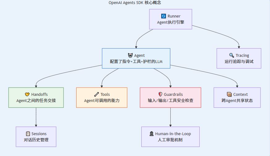 在开始编码之前,先理解SDK的设计哲学。Agents SDK围绕9个核心概念构建: