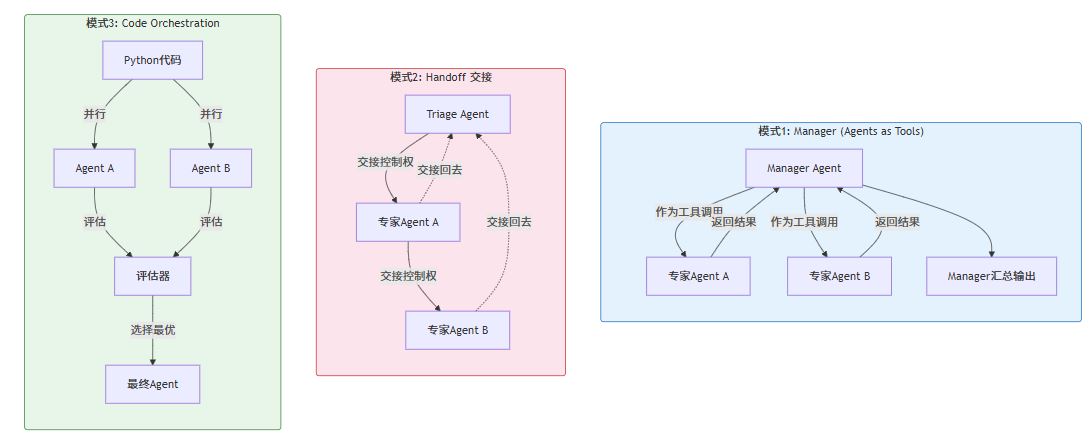 SDK提供了三种编排多Agent的模式,适用于不同场景: