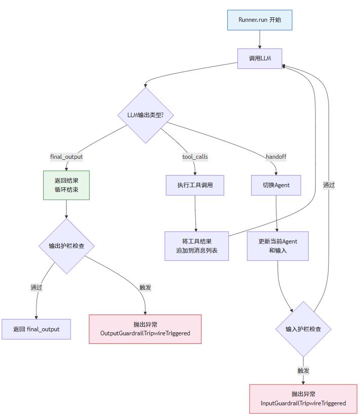 Agent执行循环:Runner.run() 启动后,SDK会执行一个循环——调用LLM、处理工具调用、处理交接,直到LLM产生最终输出或达到最大轮次。
