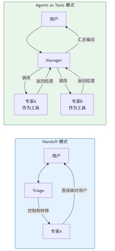 | Handoff | 专家应直接面对用户 | 去中心化交接 | 转移给专家 |