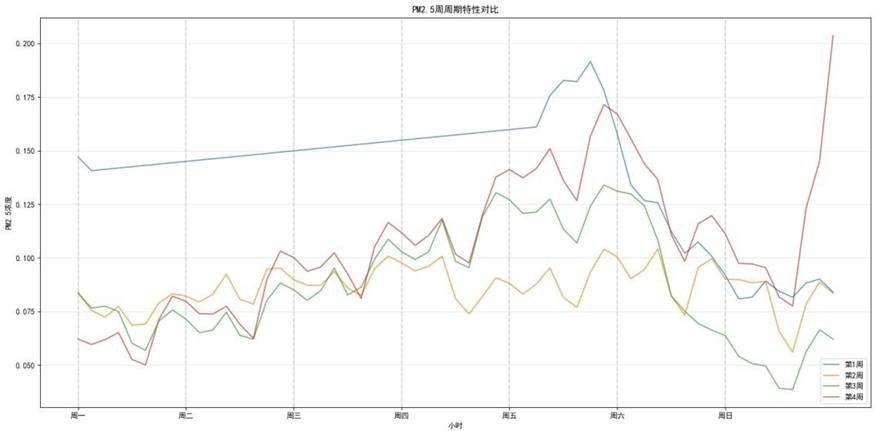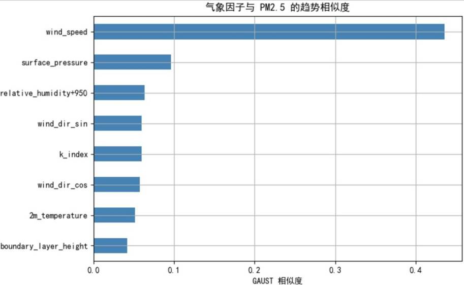 在滑动时间窗口(窗口大小为30天,步长为5天)内计算各气象因子与PM2.5浓度的Pearson相关系数,形成时变相关曲线。结果显示:风速与PM2.5的时序趋势相似度最高(平均相关系数约-0.58,风速越大浓度越低),印证了水平扩散为主导的清除机制;地面气压次之(相关系数约-0.42,低压系统伴随辐合上升利于扩散);相对湿度与PM2.5呈弱正相关(相关系数约0.23,高湿条件下气溶胶吸湿增长促进二次生成);风向的影响表现为区域差异——当风向来自工业区方向时相关性转正。这些结果直接指导了后续建模中特征权重的差异化设计(如为风速特征分配更高的注意力分数)。