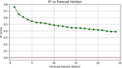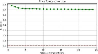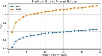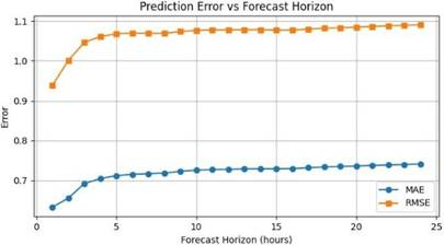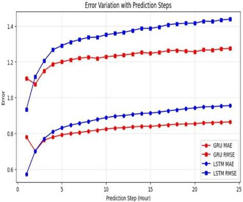 从误差随预测步长的变化曲线可见:DGCRN的误差增长最为平缓,从第1步到第24步RMSE仅上升约32%,呈现较强的多步预测稳定性;Informer的误差在第8步后加速上升,第24步误差已达到第1步的2.1倍;LSTM/GRU介于两者之间,但后期误差仍显著高于DGCRN。