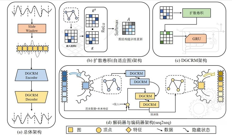 - 时序单元:使用改写的门控循环单元(GRU),将线性门(更新门、重置门)替换为扩散图卷积操作,形成DGCRM(动态图卷积循环模块)。这使得网络在每个时间步都能同时捕捉: