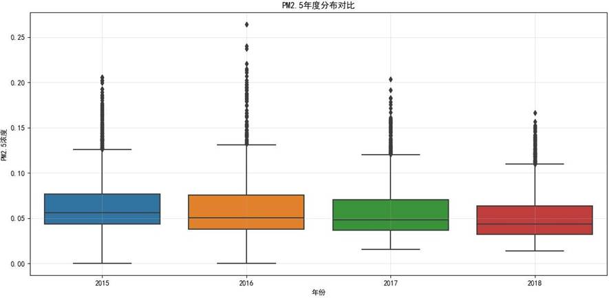 - 年周期:呈现明显的“冬高夏低”季节锁定效应。冬季静稳天气(逆温层频繁出现、混合层高度降低)利于污染物累积,而夏季对流活动和降水冲刷显著降低浓度。三个年份间PM2.5中位数持续下降(2015→2016下降约11%,2016→2017下降约9%),箱体收窄,极端峰值减少,表明该区域污染治理措施(如燃煤锅炉改造、工业排放标准收紧)效果显著。