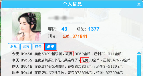 2、在消息栏里,选择“消费”,即可查询QQ农场和QQ牧场近期2天内的50条左右的金币消费情况。如图: