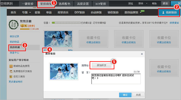 2、点击“装扮商城”后点击右侧“我的装扮”,再点击左侧侧边栏中“我的收藏”后,选择您要推荐的装扮,点击正文的“推荐”,在弹出的推荐装扮的框中点击“添加好友”,再将您要推荐的好友选择便可完成。