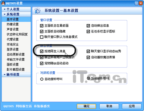 如果你经常受到一些陌生人发来消息的骚扰,那我们可以来拒绝接受消息。点击“菜单-个人设置”,在弹出的窗口中点击左面“系统设置-基本设置”,接着把右面的“拒绝陌生人消息”选中就可以了。如果你不喜欢系统默认的好友上线提示,那可以把下面的“禁止所有用户的上线提示”选中,这样就不会有提示了(如图1)。