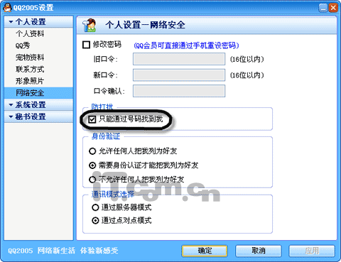 经常会有一些人加我好友,通过他们后就会给我发送一些乱七八糟的消息,他们一定是在“查找”的“看谁在线”功能找到我的,其实我们可以把自己从在线名单隐藏掉。打开QQ的“个人设置”窗口,点击左面的“个人设置-网络安全”,接着把右面的“只能通过号码找到我”选中,这样只有知道你号码的人才可以找到你(如图2)。