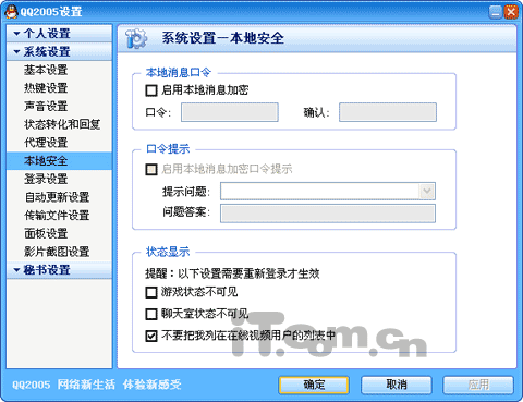 打开QQ的“个人设置”窗口,点击“系统设置-本地安全”,接着把右面的“不要把我列在在线视频的列表中”选中,这样别人就看不见你有摄像头了(如图3)。