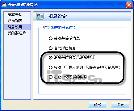 其实我们可以在QQ中把一些群设置为不接收消息。打开要进行设置的群窗口,点击上面的“群设置”按钮来打开群的“详细信息”窗口,点击左面的“消息设定”标签,接着在右面选择“消息来时只显示消息数目”就可以了,其实后面三个选项都可以实现不接收消息,大家可以根据自己的实际情况来选择(如图4)。
