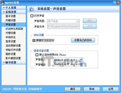 有些好友设置了一些稀奇古怪的铃声,很难听,每次发消息来都可以听见。如果你不想听到这样的炫铃,那可以在“个人设置”窗口中点击“系统设置”下的“声音设置”,把“屏蔽好友的炫铃”选中就可以了,这样就可以屏蔽掉所有好友的炫铃(如图5)。