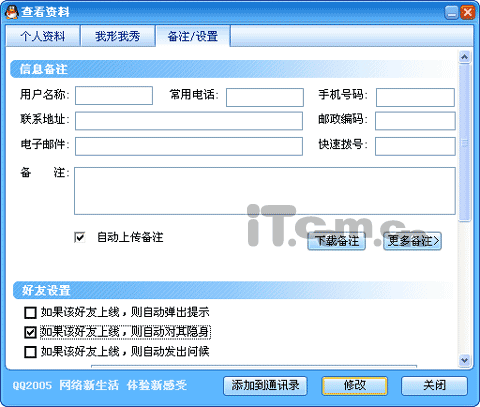 QQ里面有几个人不想和他们聊天,那就对他们一直隐身吧,打开该好友的“查看资料”窗口,点击“备注/设置”标签,把下面的“如果该好友上线,则自动对其隐身”选中就可以了(如图7)。
