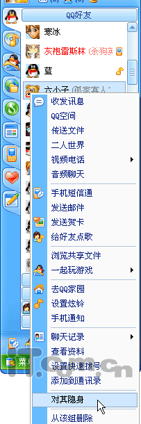 如果你是QQ会员的话,那还有一个更有效的方法,只要在要隐身的好友上点击鼠标右键,在弹出的菜单中选择“对其隐身”就可以了(如图8)。
