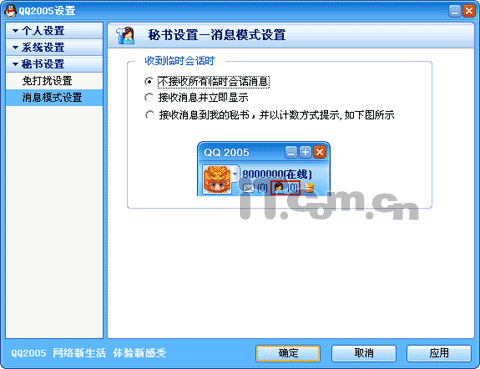 打开QQ的“个人设置”窗口,点击左面“秘书设置-消息模式设置”,接着把右面的“不接收所有临时会话消息”选中就可以了;如果你想接收,但是不想马上查看的话,那可以选中最下面的“接收消息到我的秘书,并以计数方式提示”选中就行了(如图9)。