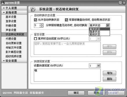 初学的朋友们都知道,QQ的自动状态转化功能可以在我们离开电脑时,将QQ自动由在线状态转化为离开状态(默认设置)。其实,这一功能在QQ2005后期的版本及QQ2006所有版本中有所增强,还能够满足我们更多的个性化需求。