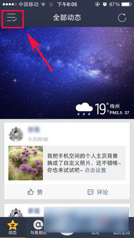 1)首先,大家下载最新版的手机QQ空间,进入后点击左上角的【三横】菜单栏,在展开的菜单栏里选择【特别关心】按钮。(如下图所示)