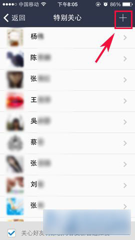 2)进入【特别关心】界面后,大家能看到【管理特别关心好友】的功能按钮,点击进入。进入后就能看到大家现在所关注的特别关心好友了,相对某个好友进行取消或者添加关注,大家就右上角的【+】按钮。(如下图所示)