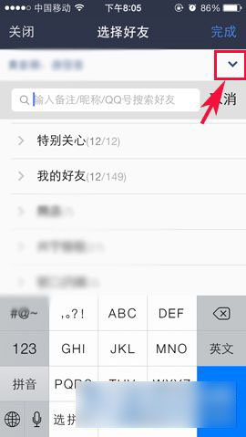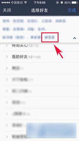在进入【选择好友】界面后,点击完成下方的伸展按钮,待伸展开大家现在所关注的好友后,大家只需要想对哪个好友却笑关注的话就点击哪个好友的昵称,点击后就会小时的了,最后点击【完成】进行保存即可。(如下图所示)
