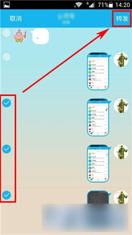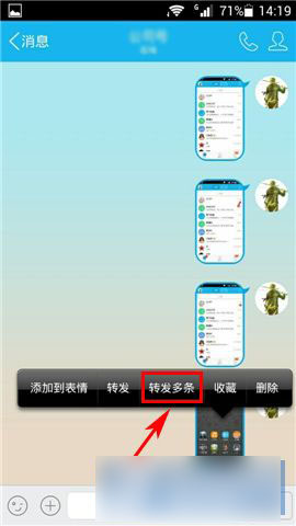 2)【长按】一条需要转发的消息,在弹出窗口选择【转发多条】,然后在需要转发的消息前面都打上【√】,点击右上角【转发】。(如下图)