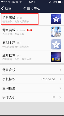 2、在个性化中心里,大家很清楚的看到了卡片装扮,点击进入;