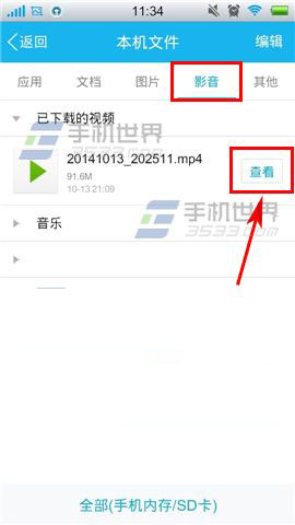 2)界面跳转后点击【本机文件】,然后点击上方的【影音】后再点击【已下载的视频】后面的【查看】就能看到视频了哦。(如下图)
