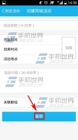 3)进去之后点击】【创建】,最后把时间、内容、地点填写进去点击【发布】就可以了。(如下图)