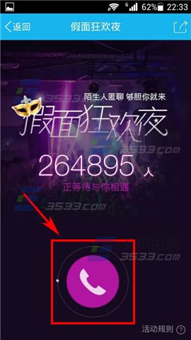 2)进入【假面狂欢夜】后,点击下方的【电话标志】就可以进入陌生人匿聊,此时系统会为你随机安排一个人进行语音聊天。(如下图)