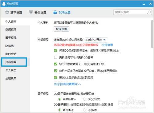 在系统设置界面点击“权限设置”子选单进入权限设置界面,再点击左侧“资讯提醒”