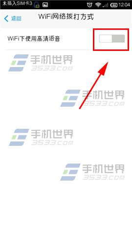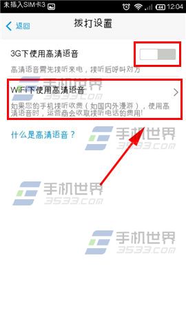 3)土嚎请点击开启【3G下使用高清语音】,选择【wifi下使用高清语音】的就点击进去开启哦。(如下图)