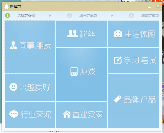 第二步、点击创建群之后,选择类别,里边有:同事朋友,兴趣爱好,行业交流,粉丝交流等等,自己选一个即可。