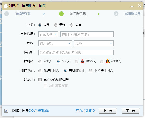 第三步、选择一个类别之后,例如选择同事亲友类别之后,下一步选择分类,同时创建群名称。并设置下群验证,是否公开等,点击下一步。