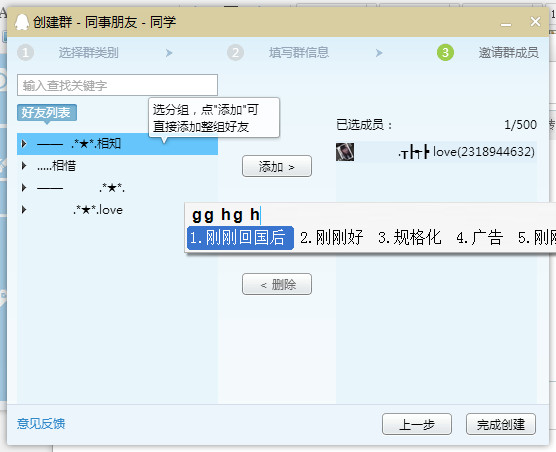 第四步、接上一步,在你的好友列表里边,将需要的人直接邀请进群。或者不邀请列表里的人,直接点击“完成创建”。