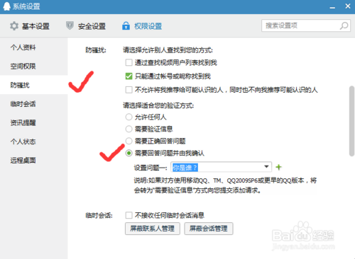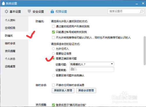 在权限设置下,选择防骚扰模式打开,选择适合你的验证方式,如回答问题