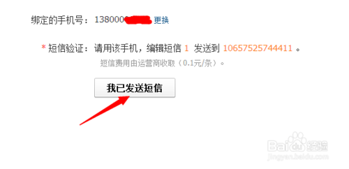 弹出了另外一个页面,提示你用该手机编辑1发送到一个号码,发完以后,点击”我已发送短信“按钮,至此,手机绑定就成功了。