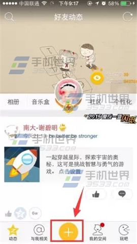 1)打开【手机QQ空间】,进入首页后点击下方的【+】按钮。(如下图)