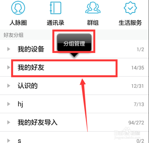 3、长按我的好友 会弹出分组管理比偶之 点进去